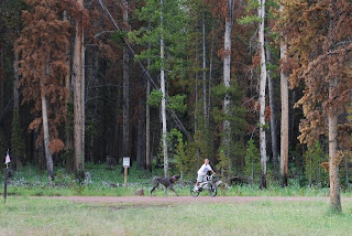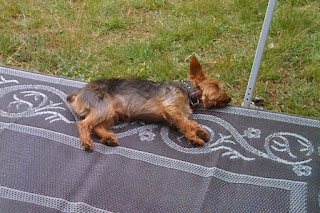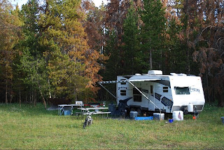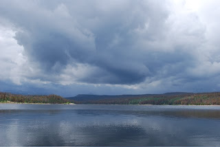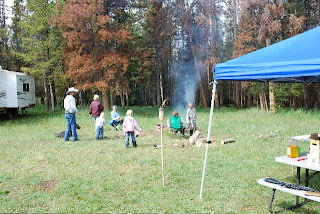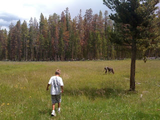 We spent the 24th of July up in the Uinta Mtns. The first day and night the weather was perfect. It was nice having some alone time with Payten. Abby and Aidan were on vacation with their Dad and Step-mom and Dallin and Tyson had to work. Melly's family came up the next day and brought the rain with them. The thunderstorms were impressive. I love watching and listening to storms roll in. It does hamper some of the activities we like to do while camping, but on the other hand it forces us to to pack in a little closer. It was fun playing card games and visiting during the storms. All the while Grandpa was hiking around in the forest collecting branches trying to keep the fire going. Our wimpy house dogs were exhausted from all their freedom. Mel and I would have to occasionally go check on them after we got home to make sure they were alive. Payten caught his first fish while at the dam. He was the only one to catch a fish as we were quickly chased out of there by a torrential downpour and the impressive claps of thunder overhead. It was a fun trip despite the rain and a few problems we had with our NEW trailer.